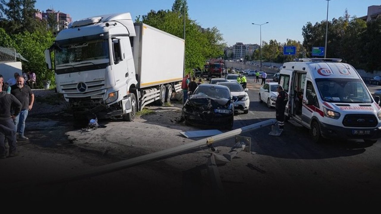 Dün Manisa'dan İzmir istikametine seyir halinde olan tır, İstanbul Caddesi'nde kontrolden çıkarak karşı şeride geçmiş, yolda aralarında polis aracı ve kamyonun da bulunduğu 9 araca çarparak yol kenarındaki dereye devrilmişti.