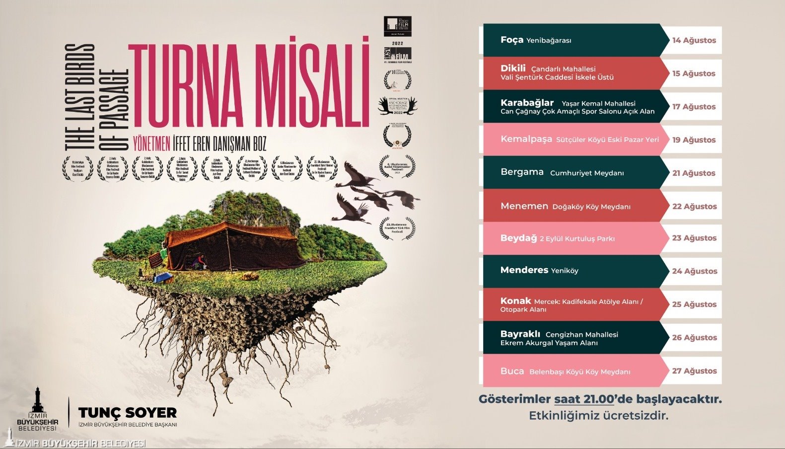 İzmir Büyükşehir Belediyesi’nin “Yeniden Sinematek” gösterimleri, 11 ayrı ilçede Ağustos ayında da izleyiciyle buluşmaya devam ediyor. Ücretsiz olarak izlenebilen “Turna Misali” filminin başlama saati 21.00. Göç hikayesini anlatan film 14 Ağustos’ta Foça’da, 15 Ağustos’ta Dikili’de, 17 Ağustos’ta Karabağlar Yaşar Kemal Mahallesi’nde, 19 Ağustos’ta Kemalpaşa Sütçüler’de izleyicilerle buluştu.