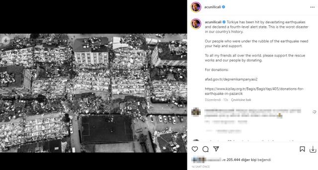 13,6 milyon takipçisi bulunan Acun Ilıcalı, Instagram hesabından yaptığı paylaşımda AFAD ve Kızılay'ın uluslararası hesaplarını paylaşarak şu ifadeleri kullandı: "Türkiye yıkıcı depremlerle sarsıldı ve dördüncü seviye alarm durumu ilan etti. Bu, ülkemizin tarihindeki en büyük felakettir. Enkaz altında kalan insanlarımızın sizlerin yardım ve desteğine ihtiyacı var. Dünyanın her yerindeki tüm dostlarım, lütfen bağış yaparak kurtarma çalışmalarına ve halkımıza destek olun.
