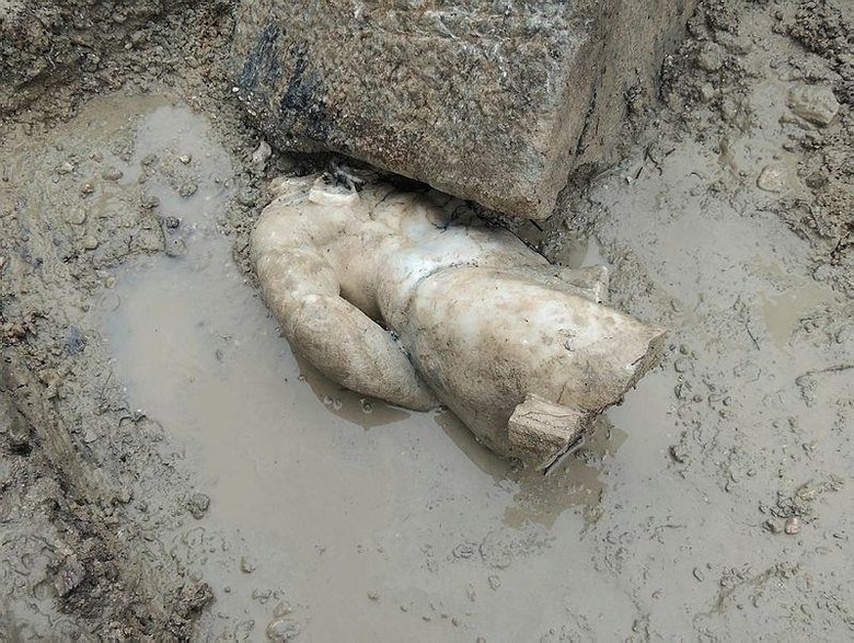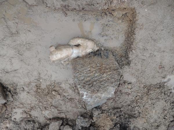 Çaydan çıkarılan heykel, arkeolojik incelemeye alındı.