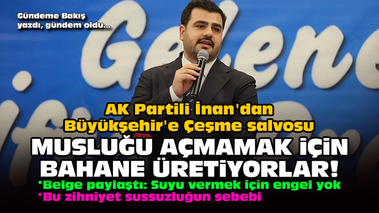 GÜNDEME BAKIŞ - Çeşme'deki su krizi siyasetin de tartışma konusu oldu. Gündeme Bakış'ın İZSU yetkililerine dayandırdığı haber gündem oldu. İZSU yetkililerinin, "Karareis Barajından Kutlu Aktaş Barajına su verildi ama depolara verilmedi. Numune almamıza izin verilmiyor. Bu yüzden şebekeye su verilmiyor" açıklamasına AK Parti Genel Sekreteri ve İzmir Milletvekili Eyyüp Kadir İnan yanıt verdi. İnan, şunları söyledi: