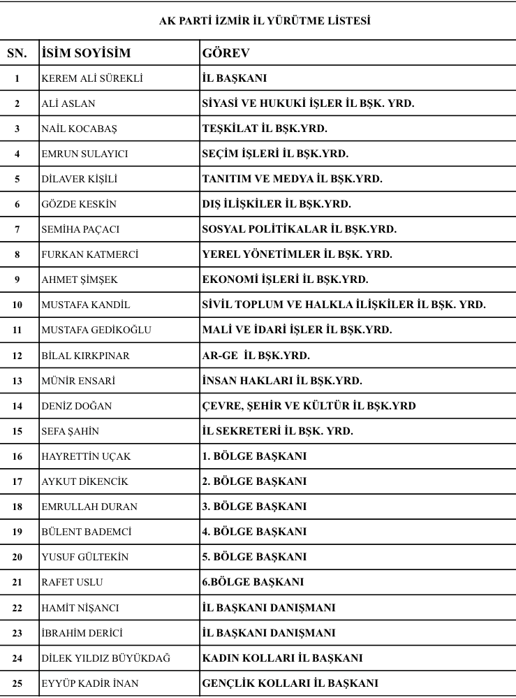 Çevre Şehir ve Kültür İşlerinden Sorumlu İl Başkan Yardımcısı Ahmet Şimşek Ekonomi İşlerinden Sorumlu İl Başkan Yardımcısı oldu. Çevre Şehir ve Kültür İşlerinden Sorumlu İl Başkan Yardımcılığı görevine ise, AK Parti İzmir Milletvekili Binali Yıldırım’a yakın siyaset yapan Deniz Doğan atandı.