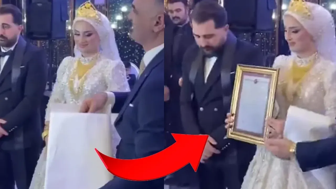 Baba takı merasimi sırasında eline aldığı büyük bir zarfta çerçevelettiği ev tapusunu altın renkli bir çerçevede sundu. Düğündeki ev jesti sosyal medyada gündem oldu.
