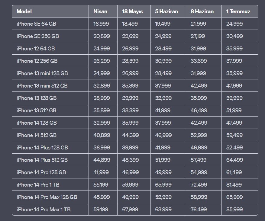Son zamla birlikte Apple’ın en pahalı telefonu olan iPhone 14 Pro Max’in 1 TB hafızalı modeli 76 bin 499 TL’den 85 bin 999 TL’ye çıktı. Bu ürünün 2023 Nisan’daki fiyatı ise 59 bin 199 TL idi.