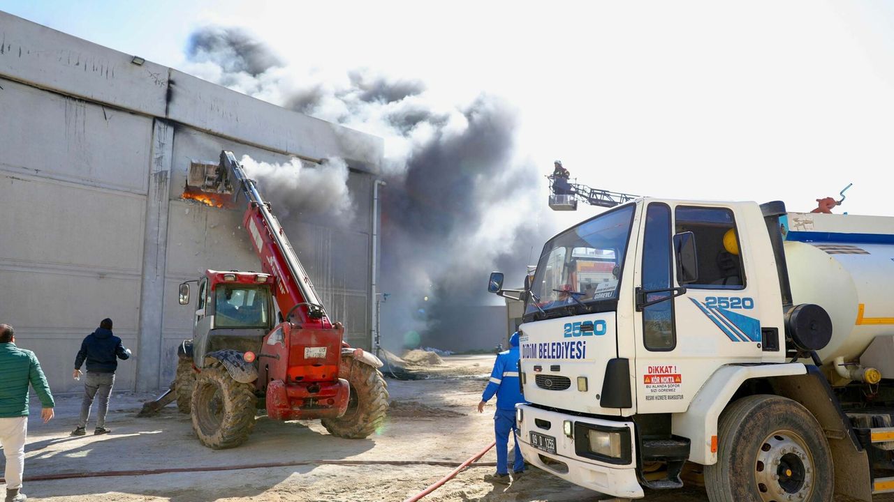Küçük Sanayi Sitesi'ndeki bir inşaat malzemeleri deposunda, bugün saat 15.00 sıralarında yangın çıktı. İhbar üzerine olay yerine itfaiye ekipleri sevk edildi. Söndürme çalışmalarına Didim Belediyesi ekipleri de destek verdi. Alevlerin çevredeki iş yerlerine sıçramaması için yoğun çaba sarf edildi. Didim Belediye Başkanı Hatice Gençay söndürme çalışmalarını ekiplerle yerinde inceleyip, bilgi aldı. Müdahale sürecini yakından takip eden Başkan Gençay, ilgili birimlerle koordinasyon sağlayarak sürecin etkin şekilde yürütülmesini sağladı. Alevlere müdahale sürüyor.
