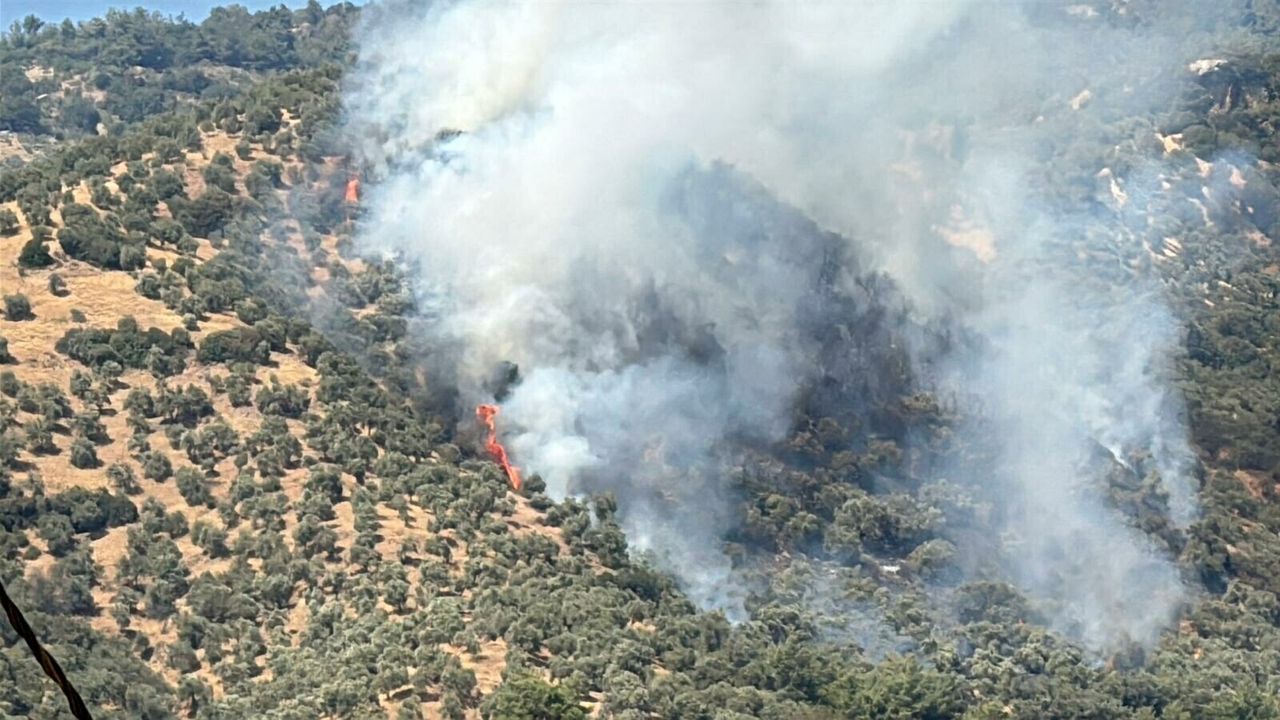 Aydın'da zeytin ağaçlarıyla kaplı tarım arazisinde yangın çıktı. Bölgeye sevk edilen ekipler, alevlere havadan ve karadan müdahale ediyor.