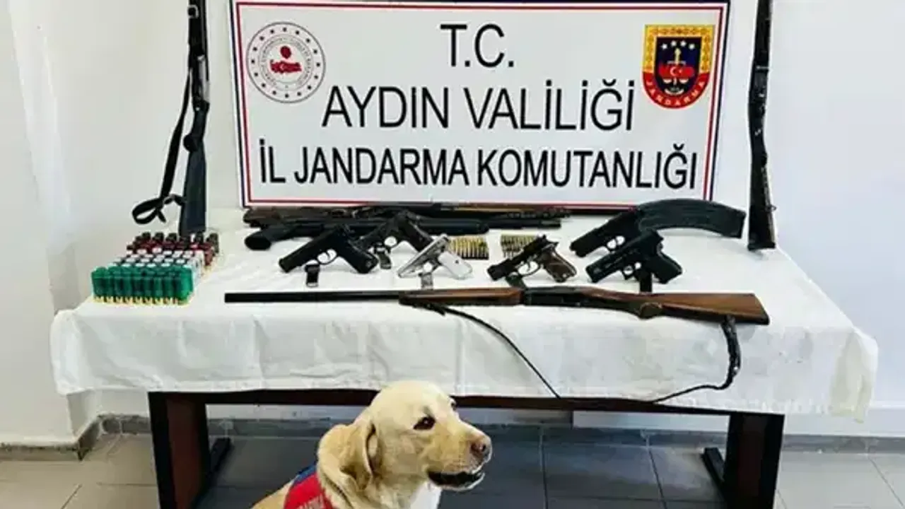 Özel eğitimli bomba arama köpekleri kullanılarak evde yapılan aramada; 6 ruhsatsız tabanca, 2 tam otomatik av tüfeği, 3 yarı otomatik av tüfeği, 6 tabanca şarjörü, 1 otomatik tüfek şarjörü, 178 fişek ve 81 av tüfeği fişeği ele geçirildi.