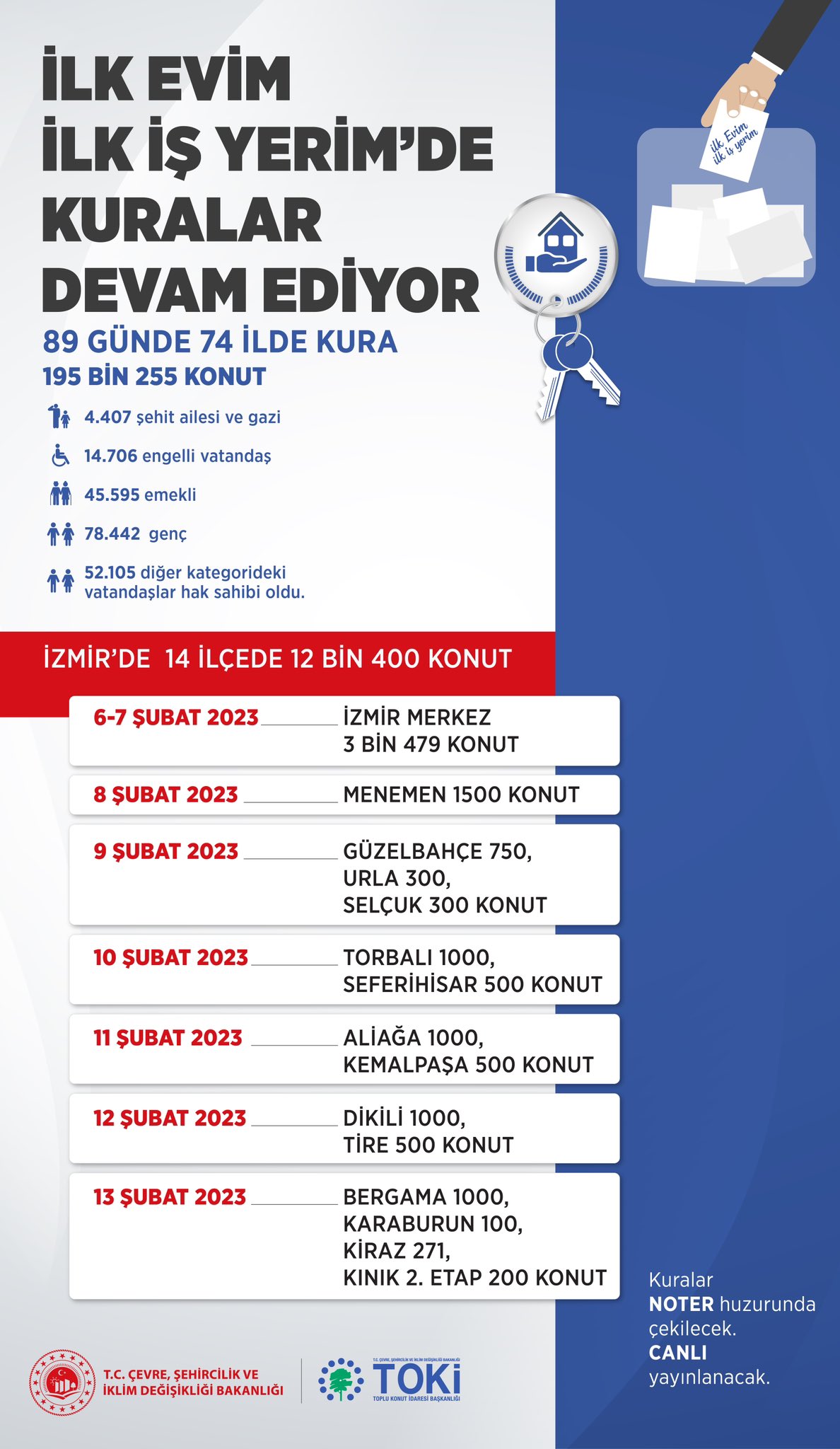 Kurum, yarından itibaren 8 gün boyunca İzmir'de 12 bin 400 konutun kurasının çekileceğini belirtti.