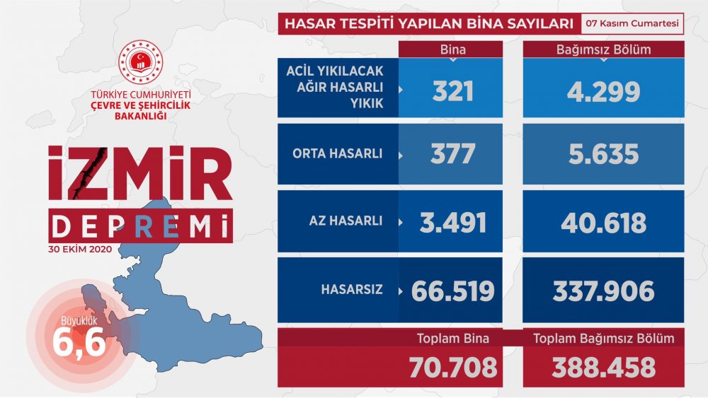 Bakan Kurum,'İzmir’de depremin hemen ardından başlattığımız hasar tespit çalışmalarımız kapsamında 388 bin 458 bağımsız bölümde inceleme yaptık. Ekip arkadaşlarımızın yoğun gayretleriyle 3 gün içinde tespitlerimizi tamamlayarak depremden etkilenen bölgelerin hasar haritasını çıkaracağız' diye konuştu.