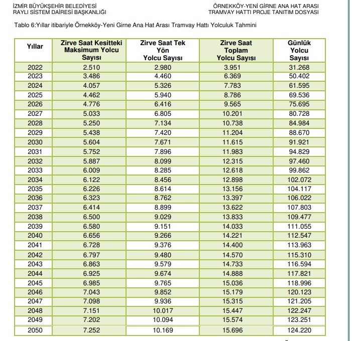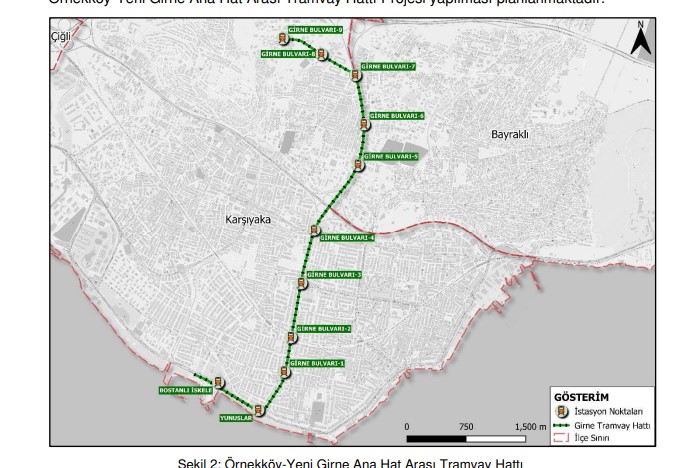“İzmir Büyükşehir Belediyesi, Raylı Sistem Dairesi Başkanlığı tarafından İzmir İli, Karşıyaka İlçesi sınırları içerisinde 9 adet istasyona sahip 5.15 km uzunluğunda Örnekköy Yeni Girne Ana Hat Arası Tramvay Hattı Projesi yapılması planlanmaktadır. 2030 İzmir Ulaşım Master Planında yer alan söz konusu Örnekköy- Yeni Girne Ana Hat Arası Tramvay Hattı, (Karşıyaka ve Çiğli Tramvay Hattı entegre olacak şekilde, Bostanlı İskele Tramvay Durağı- Girne Bulvarı-Girne Caddesi-Örnekköy Kentsel Dönüşüm Bölgesi ve Nazım Hikmet Bulvarı) kentin bu kesiminde yer alan yoğun nüfusa hizmet vermek için tasarlanmış olup hat planlı ve yerleşik alanlar içerisinde projesi yapılacaktır. 5.15 km olan bu hattın mevcut işletmedeki Karşıyaka-Çiğli Tramvay Hattına entegre olması planlanmaktadır. Ulaşım sisteminin bir bütün olarak çözülmesi ve ulaşım modları arasındaki uyum ve işlerliğin, teknik anlamda şehir içi ulaşım probleminin çözüm ortağı kabul edildiği raylı ve kablolu sistem hatları günümüzde büyük önem arz etmektedir. Bunun yanında raylı ve kablolu toplu taşıma sistemleri tüm kentin arazi kullanım ve ulaşım yapısını etkileyen, yüksek maliyetli, büyük yatırımlardır. İzmir Ulaşım Ana Planı’nda, “Ulaşım Ana Planı ile İzmir halkının ulaşımdaki konfor seviyesini yükseltmek ve kentiçi hareketliliğin çevresel tehdit yaratmadan makro ve mikro ölçekteki sorunlara çözümler üretilmesi, kaynakların verimli kullanılarak toplumun tüm kesimlerine hitap edebilen sürdürülebilir çözümlerin oluşturulması” genel hedefi belirtilmiştir. Bu kapsamda Karşıyaka ilçesinde hedef yılında beklenen gelişmelere göre kuzey kesimlerden Karşıyaka merkez yönünde oluşacak yolculuk talebinin Girne Bulvar’ında toplulaşmasıyla bu aks üzerinde bir ana omurga hat oluşturulabilmiştir. Bu hat, yolcu değerlerine göre tramvay hattı olarak planlanmıştır. Proje güzergahı, İzmir’in Karşıyaka ilçesinde Bostanlı Sahil bölgesinden başlayarak, Karşıyaka İlçesi ile Bayraklı İlçe sınırı olan Girne Bulvarı’ndan devam ederek Karşıyaka İlçe sınırları içerisinde son bulmaktadır. Bostanlı Sahilde; Bostanlı İskele Durağı ve Yunuslar Durağında olmak üzere 2 istasyon noktasında Karşıyaka Tramvay Hattı ile entegre olmaktadır. Bunun yanı sıra Girne Bulvarı’nda bulunan 3. İstasyon noktasında yaklaşık 400 metre yürüme mesafesi ile İZBAN Hattı’nın Nergiz İstasyonu’na entegre olmaktadır”