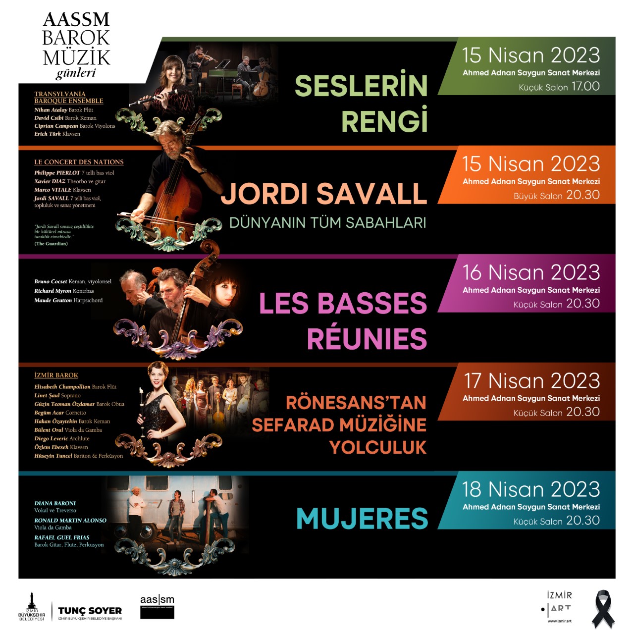 16 Nisan Pazar günü 20.30’da AASSM, “Les Basses Reunies” konserine ev sahipliği yaparken, 17 Nisan Pazartesi günü 20.30’da İzmir Barok “Rönesans'tan Sefarad Müziğine Yolculuk” konseri ile program sürecek. AASSM Barok Müzik Günleri, 18 Nisan'da 20.30’da yapılacak Mujeres “Kadınlar” konseri ile son bulacak.