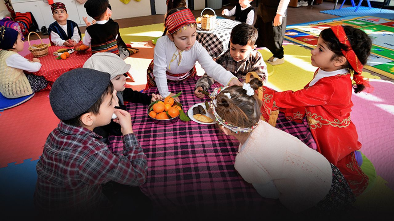 Merkezden yararlanan 3-6 yaş arası minikler, getirdikleri yiyeceklerin yetiştiği yörelere ait kıyafetler giyerek yerli üretimin önemine dikkat çekti.