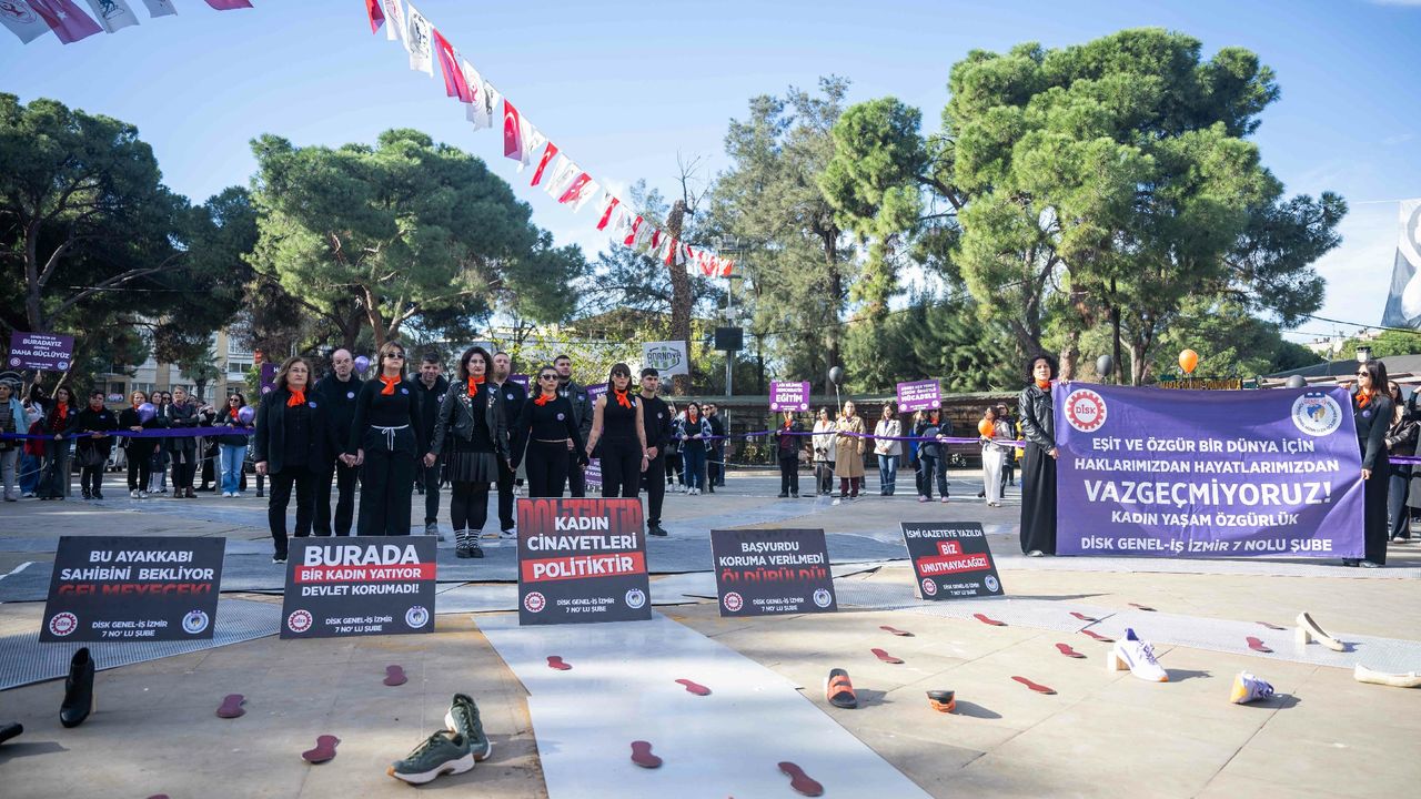 Bornovalı emekçi kadınların 25 Kasım buluşması ise Büyükpark’ta düzenlendi. Etkinlikte DİSK Genel İş 7 No’lu Şube Kadın Komitesi Başkanı Gülistan Tilkici hazırlanan bildiriyi okudu. Kadına yönelik şiddet tiyatral bir sunumla ele alınırken, katılımcılar sloganlar atarak dayanışmanın gücünü ortaya koydu. Program, balonların hep birlikte gökyüzüne bırakılmasıyla simgesel bir mesajla sona erdi.
