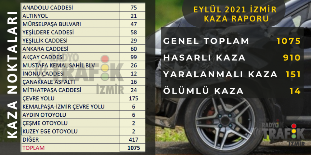 İzmir’de en fazla trafik kazasının meydana geldiği ay 2021 Eylül ayı oldu. Radyo Trafik Haber Merkezi’ne ulaşan bilgilere göre 30 günde bin 75 trafik kazası yaşandı. Bu kazalardan 151’i yaralanmalı, 14’ü ölümlü olarak kayıtlara geçti.