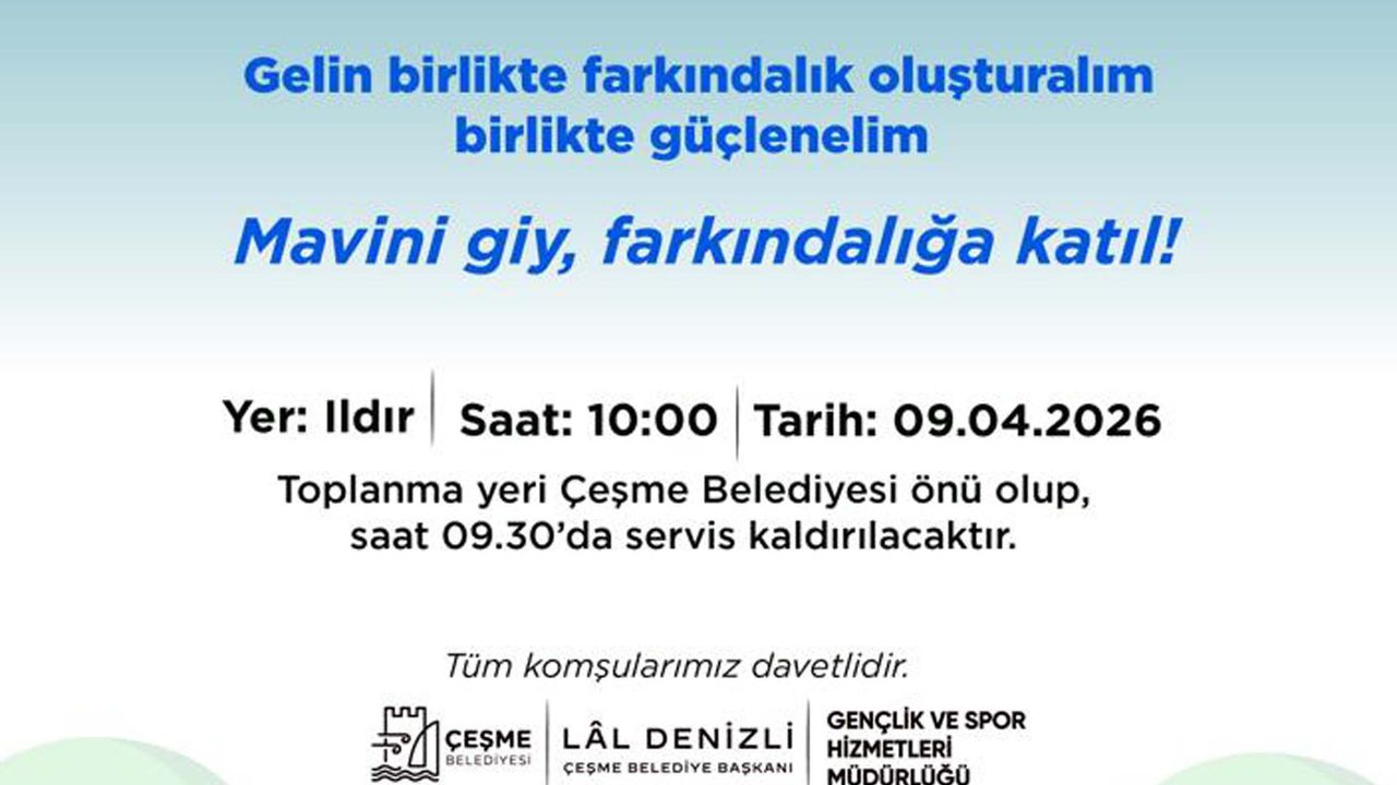 Çeşme Belediyesi, otizm konusunda toplumsal farkındalığı artırmak amacıyla etkinlik düzenlenecek. Çeşme Belediyesi Gençlik ve Spor Hizmetleri Müdürlüğü koordinasyonunda gerçekleştirilecek etkinlik 9 Nisan'da Ildır'da gerçekleştirilecek 'Otizm Farkındalık Yürüyüşü' ile sevgi, anlayış ve kabulün önemine dikkat çekilecek. Farklılıkların zenginlik olduğu anlayışıyla düzenlenen yürüyüşte, otizme yönelik toplumsal duyarlılığın artırılması ve kapsayıcı bir yaşam kültürünün güçlendirilmesi hedeflendiği belirtildi. Tüm Çeşmelilerin davetli olduğu etkinlikte katılımcıların, mavi renk giyerek farkındalık mesajını vereceği bildirildi. Yürüyüş, saat 10.00'da Ildır'da başlayacak. Katılım sağlamak isteyen vatandaşlar için Çeşme Belediyesi önünden saat 09.30'da servis kaldırılacak.
