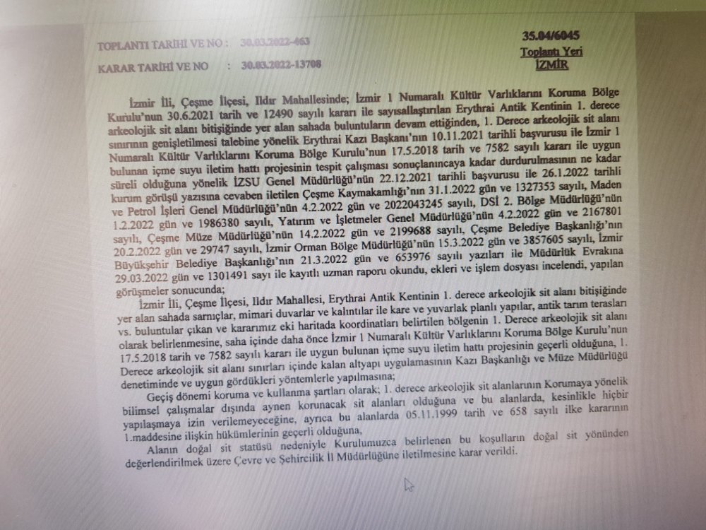 Izmir Ili, Çeşme llçesi, Ildır Mahallesi, Erythrai Antik Kentinin 1. derece arkeolojik sit alanı bitişiğinde yer alan sahada sarnıçlar, mimari duvarlar ve kalıntılar ile kare ve yuvarlak planlı yapılar, antik tarım teraslanı vs. buluntular çıkan ve kararımız eki haritada koordinatları belirtilen bölgenin 1. Derece arkeolojik sit alanı olarak belirlenmesine, saha içinde daha önce Izmir 1 Nurmaralı Kültür Varlıklarını Koruma Bölge Kurulu'nun 17.5.2018 tarih ve 7582 sayılı kararı ile uygun bulunan içme suyu iletim hatti projesinin geçerli olduğuna, 1. Derece arkeolojik sit alanı sınırları içinde kalan altyapı uygulamasının Kazı Başkanlığı ve Müze Müdürlüğü denetiminde ve uygun gördükleri yöntemlerle yapılmasına, Geçiş dönemi koruma ve kullanma şartları olarak, 1. derece arkeolojik sit alanlarının Korumaya yönelik bilimsel çalışmalar dişinda aynen korunacak sit alanları olduğuna ye bu alanlarda, kesinlikle hiçbir yapılaşmaya izin verilemeyecegine, ayrıca bu alanlarda 05.11.1909 tarih ve 658 sayılı ilke kararının 1.maddesine ilişkin hükümlerinin geçerli olduğuna,