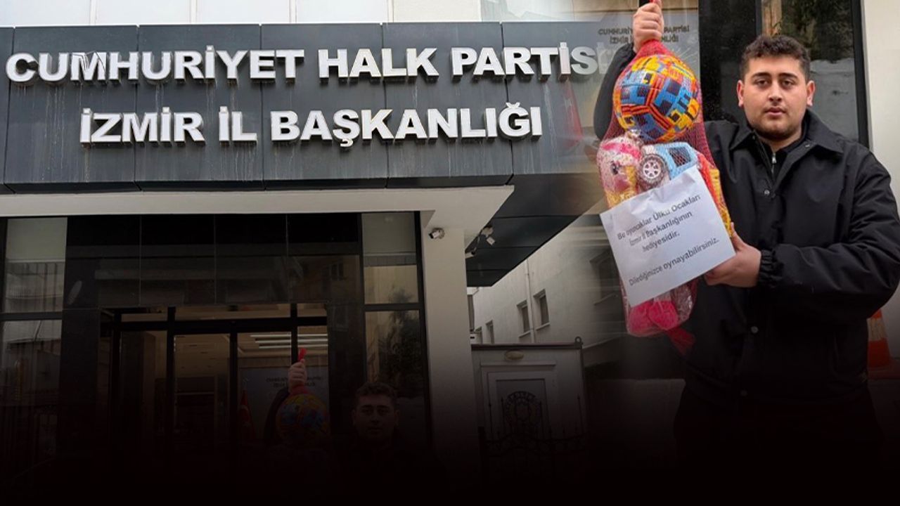 CHP İzmir İl Örgütü'nün şikayetinin ardından Ülkü Ocakları üyesi bir genç, tepkisini CHP İzmir İl Başkanlığı’na gidip bir paket oyuncak bırakarak gösterdi.