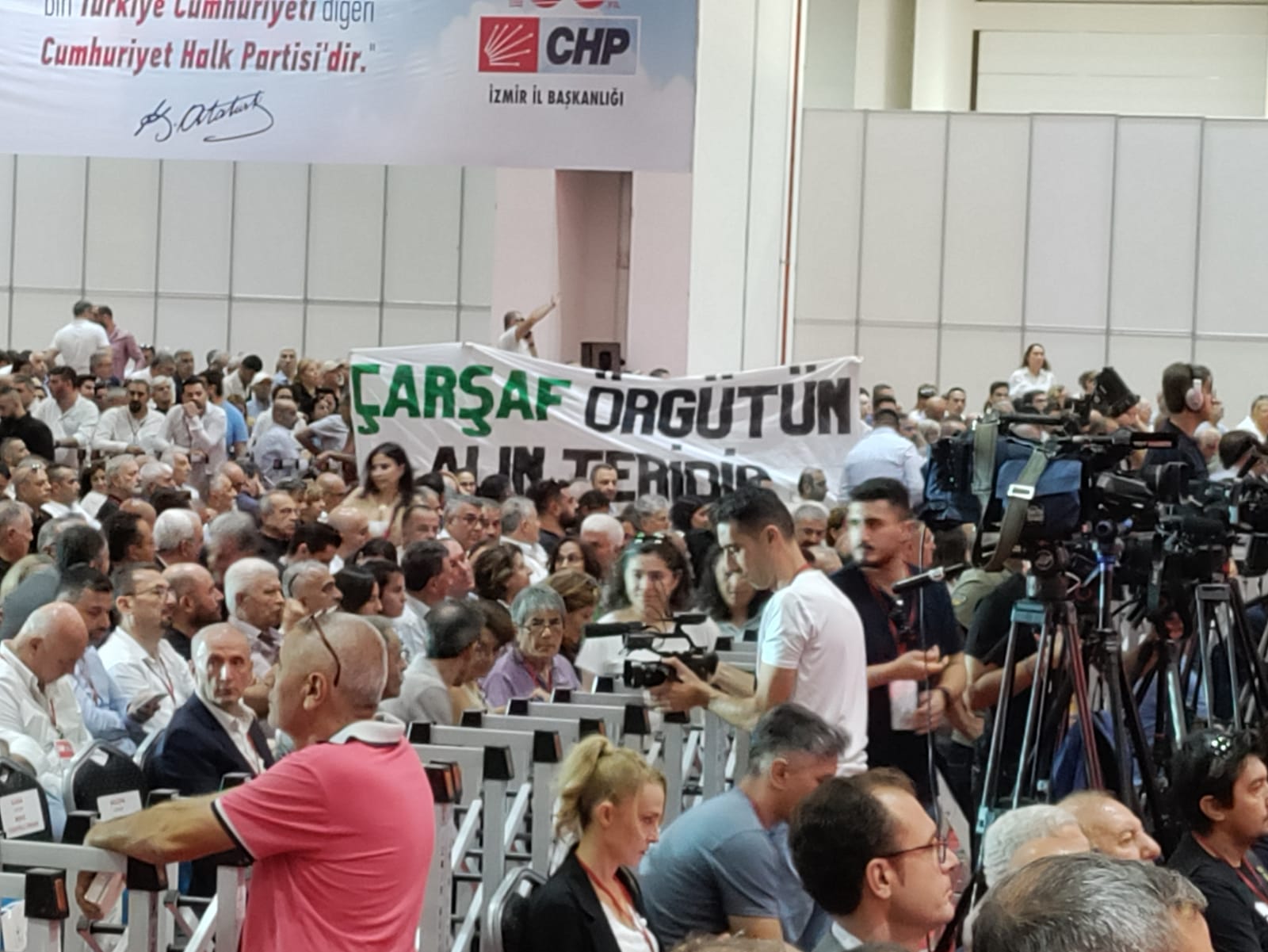 Kongre salonunda bazı genç partililer "Çarşaf liste" sloganları atarak, pankart açtı.