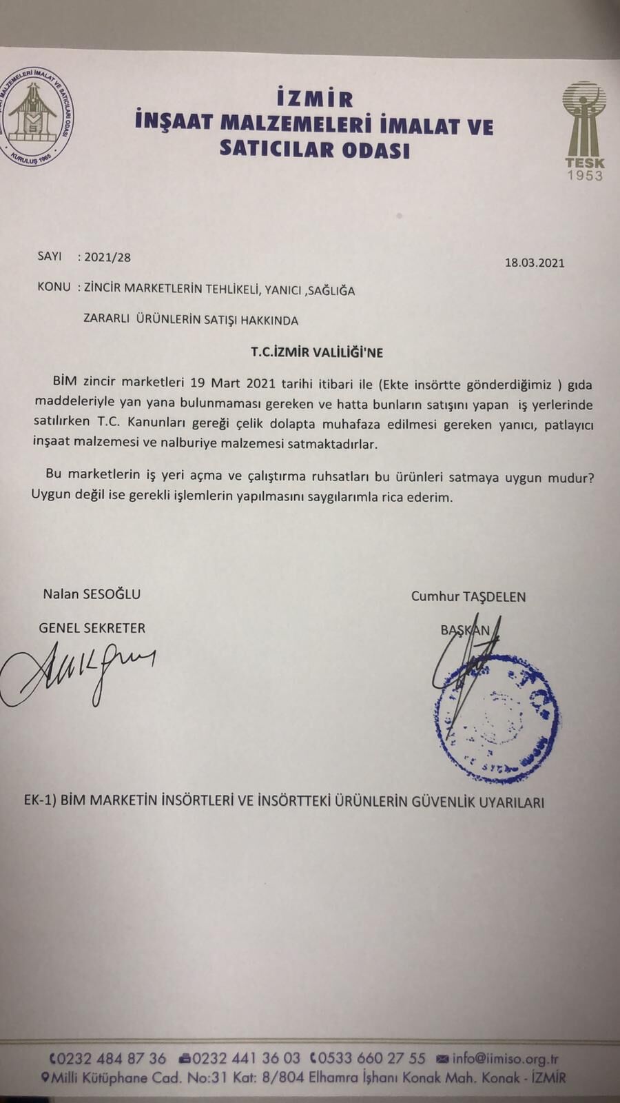 Pandemi nedeniyle yayınlanan genelgede, ruhsat farklılıkları göz önüne alınarak, market zincirleri pazar günleri saat 17.00’ye kadar muaf bırakılmıştı. İnşaat malzemeleri, tuhafiye, kasap, oyuncak, kırtasiye satışı yapan esnafların ise pazar günü çalışmamasına karar verilmişti. Böylece, yasaklı olan esnafın sattığı ürünlerin, market zincir mağazalarında satışına engel olmadığı tespit edilmişti İzmir İnşaat Malzemeleri İmalat ve Satıcıları Odası Başkanı Cumhur Taşdelen, İzmir Valiliğine bu konuyu aktararak, ‘’Gıda maddeleri ile yan yana bulunmaması gereken ve hatta bunların satışını yapan iş yerlerinde, yerlerinde bu ürünleri, T.C Kanunları gereği çelik dolapta muhafaza etmektedirler. Bu marketlerin iş yeri açma ve çalıştırma ruhsatları bu ürünleri satmaya uygun mudur?’’ görüşünü paylaşarak, rahatsızlığını dile getirmişti.