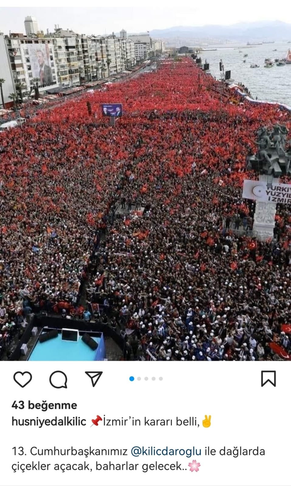 İzmir’de, dün Cumhurbaşkanı ve AK Parti Genel Başkanı Recep Tayyip Erdoğan, Gündoğdu Meydanı’nda miting yaparken, bugün de Gündoğdu Meydanı’nın Cumhuriyet Meydanı tarafına kurulan sahne ile Millet İttifakı Adayı Kemal Kılıçdaroğlu miting düzenledi. Bir süre önce AK Parti’den CHP sıralarına geçen Karşıyaka Belediye Meclisi Üyesi Hüsniye Dalkılıç, bugün gerçekleşen Kemal Kılıçdaroğlu’nun havadan alanı gören miting fotoğrafı yerine, Cumhurbaşkanı Recep Tayyip Erdoğan’ın mitingine ait havadan alanı gören fotoğrafı paylaşıp, ‘’İzmir’in kararı belli. 13. Cumhurbaşkanımız Kemal Kılıçdaroğlu dağlarda çiçekler açacak, baharlar gelecek.’’ ifadelerini kullandı.