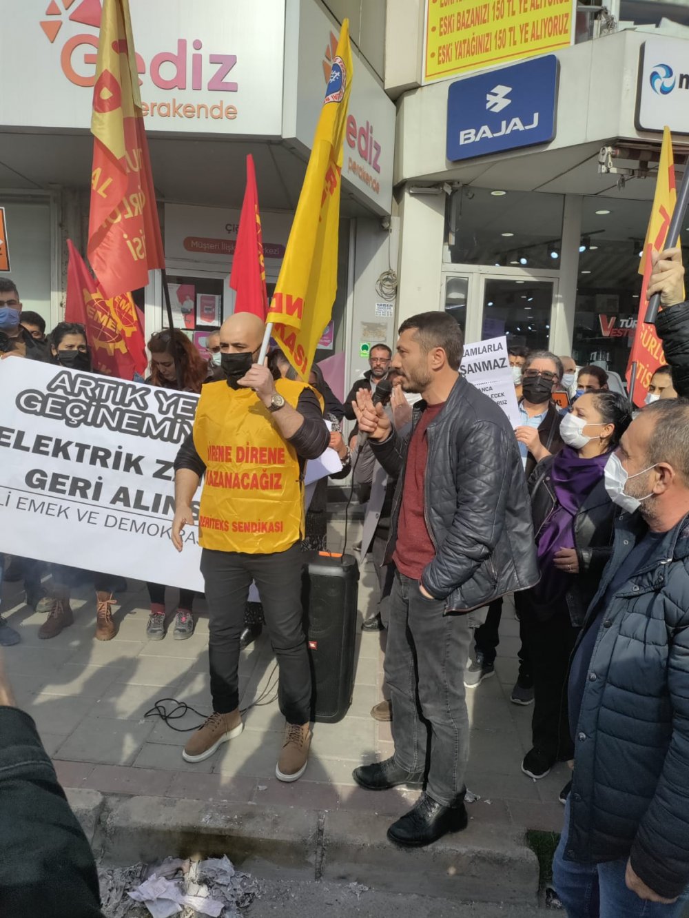 GÜNDEME BAKIŞ- Gece gündüz fabrikalarda çalışmalarına rağmen gelinen noktada kira öder gibi elektrik faturası ödediklerini ve enerjide dışa bağımlılığın bedelinin ve faturasının işçiye emekçiye kesildiğini kaydeden Deri Dokuma ve Tekstil İşçileri (DERİTEKS) Sendikası İzmir Şube Başkanı Mehmet Selli, “Hiçbir sosyal hayatımız kalmadı hepimiz sadece faturalarımızı ödemek için çalışıyoruz. Metal İş Kolundaki işçi arkadaşlarımız, Aliağa Gemi Sökümde çalışanlar bu sömürüye karşı ayağa kalkmış durumdadır. İnsanların artık kirasından daha fazla faturası gelmektedir. Buna dur demek için bugün alanlara indik ve bundan sonra da mücadelemiz devam edecektir” diye konuştu.
