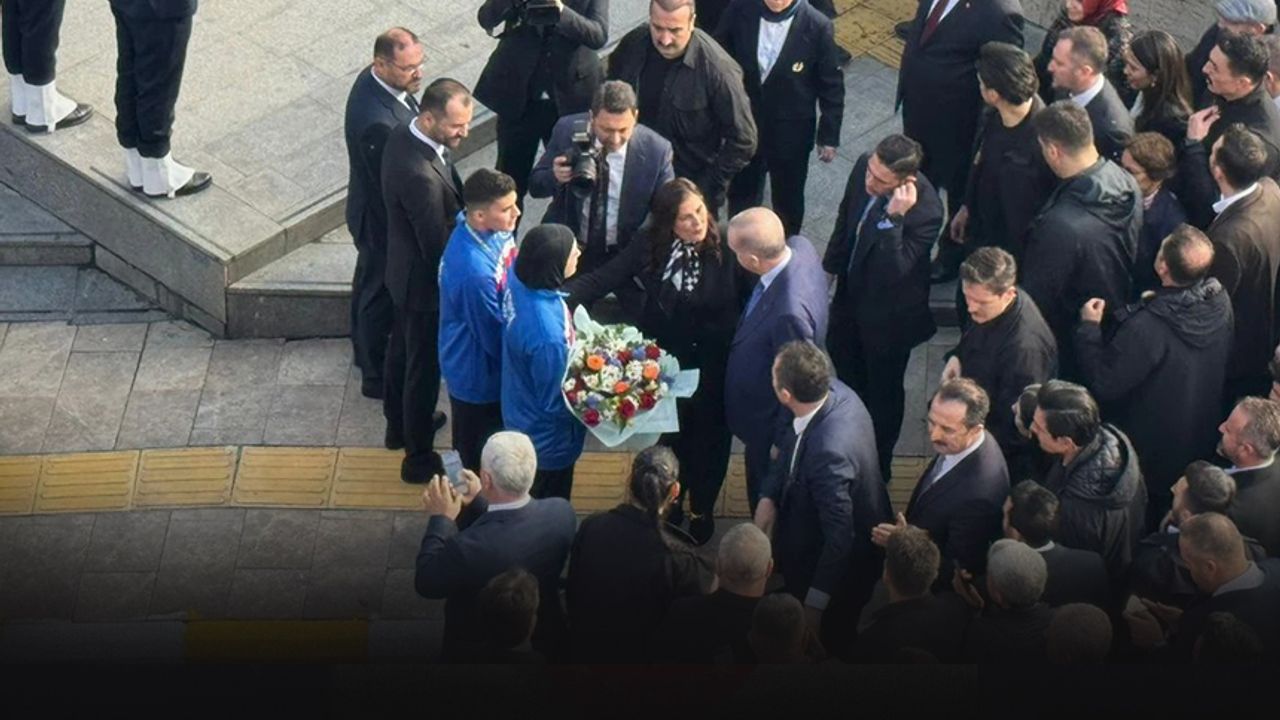 Cumhurbaşkanı Erdoğan’ı belediye binası girişinde Aydınlı sporcular Elif Naz Köseoğlu ve Muaz Erdem Madran karşıladı.
