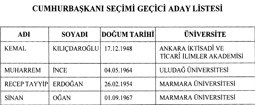 Resmi Gazete’de yayımlanan Yüksek Seçim Kurulu kararı ile geçici aday listesi yayımlandı. Karara göre Kemal Kılıçdaroğlu ve Recep Tayyip Erdoğan’ın adaylık başvuruları kabul edildi.