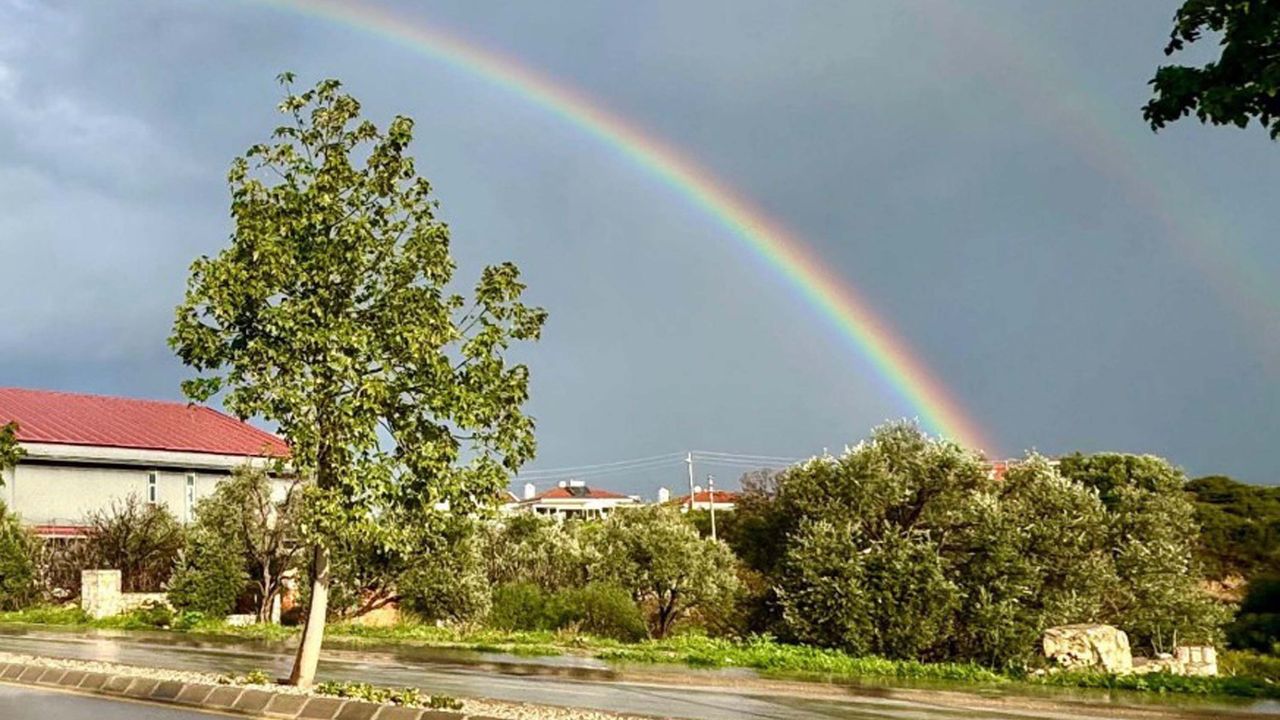 Datça ilçesinde sabah saatlerinde başlayan sağanak, kısa süreli etkili oldu. Yağmur bulutlarının bir anda dağılıp güneşin yüzünü göstermesiyle, çift gökkuşağı ortaya çıktı. Çift gökkuşağı görenleri hayran bıraktı. Gökkuşağının sunduğu görsel manzara vatandaşlar tarafından cep telefonlarıyla kaydedildi.(DHA)