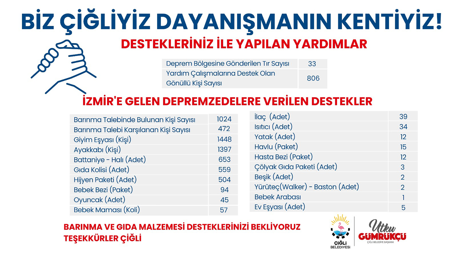 Başkan Utku Gümrükçü’nün çağrısıyla başlatılan dayanışma seferberliği iş insanları, esnaflar, sivil toplum kuruluşları, dernekler ve Çiğlili vatandaşların katkılarıyla depremin 12. gününde hız kesmeden sürüyor. Çiğli Belediyesi Deprem Koordinasyon Merkezi’nin organize ettiği ve 806 gönüllü vatandaşın destek verdiği çalışmalar kapsamında deprem bölgesine gıda, giyim, ilaç, yakacak vb. eşyaların taşındığı 33 dayanışma tırı gönderildi.