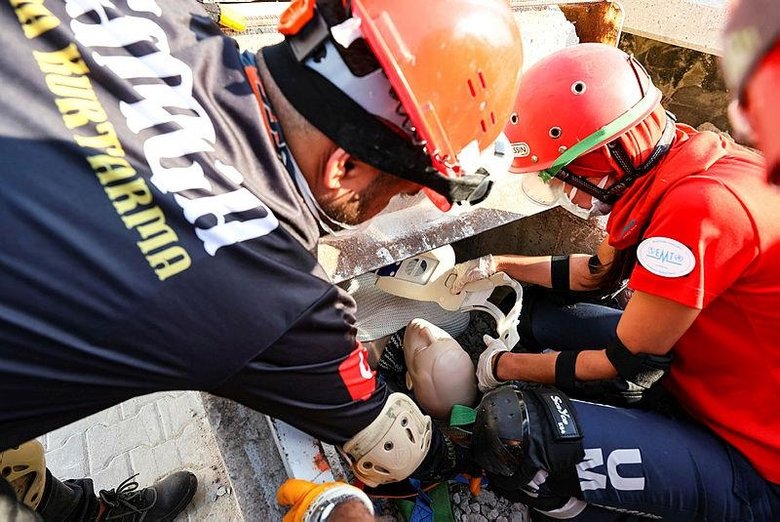 AFAD Müdürlüğü bahçesinde oluşturan eğitim parkurundaki tatbikatta senaryo gereği enkaz altında kalanlar kırıcı ve kesici aletler yardımıyla kurtarıldı, yangınlara müdahale edildi. (AA)