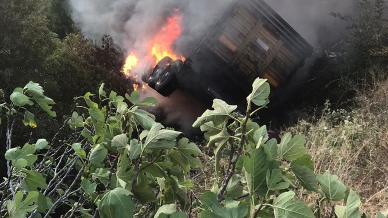 Mehmet Ay idaresindeki ve plastik atığı yüklü 64 ACD 079 plakalı kamyon, Gökköy Mahallesi Hacıoğlu mevkiinde şarampole devrildikten sonra alev aldı.