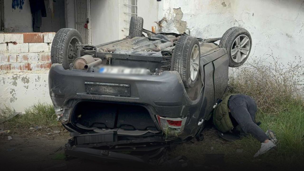 Çarpmanın etkisiyle bariyerleri aşarak yol kenarındaki eve çarpıp devrilen araçtaki sürücü yaralandı.