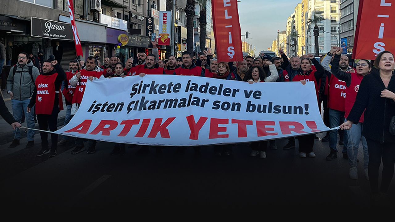 GÜNDEME BAKIŞ - İzmir Büyükşehir Belediyesi iştiraklerinde işten çıkartılan ve şirketlere iade edilen DİSK/Genel-İş Sendikası İzmir şubelerinde örgütlü işçiler eylem yaptı. Sendika yöneticileri, şube yönetimleri ve işçiler Konak Pier önünde toplanarak Basmane Fuar kapısına sloganlarla yürüdü.