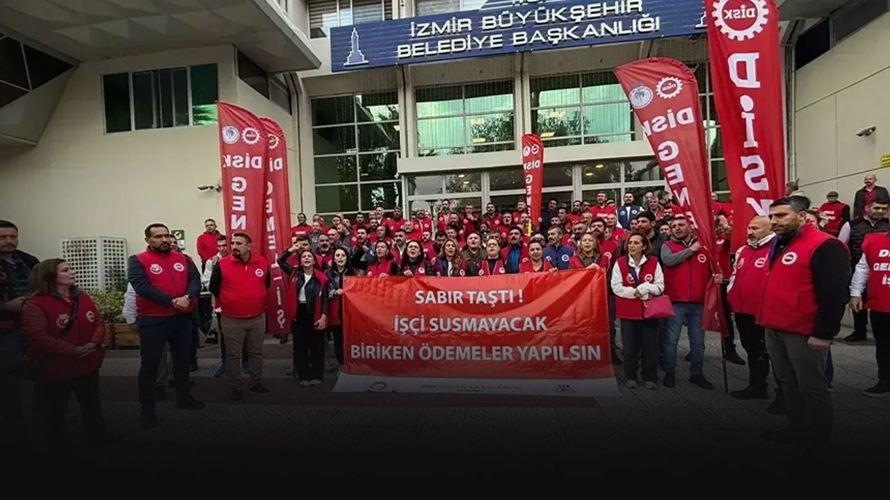 GÜNDEME BAKIŞ - İzmir Büyükşehir Belediyesi önünde, Disk / Genel-İş Sendikası İzmir 1 ve 2 Nolu Şubeleri üyesi işçiler, fazla mesai ve ikramiye ödemelerinin yapılmaması gerekçesiyle eylem düzenledi. İşçiler, belediye bürokratlarının ödeme takvimini açıklaması gerektiğini vurgulayarak haklarını talep etti. Eylemlerin devam edip etmeyeceğiz merak konusuyken sendikadan açıklama geldi. Üyelere atılan mesajda şöyle denildi: