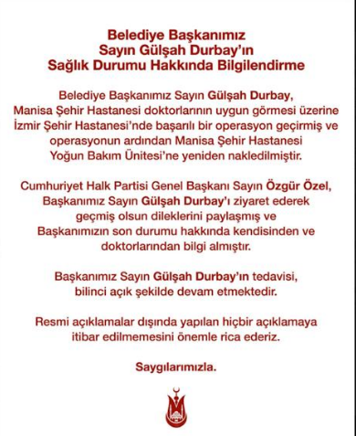 Şehzadeler Belediye Başkanı Sayın Gülşah Durbay, Manisa Şehir Hastanesi doktorlarının uygun görmesi üzerine İzmir Şehir Hastanesi’nde operasyon geçirdi. Operasyonun ardından Manisa Şehir Hastanesi Yoğun Bakım Ünitesi’ne nakledildi.