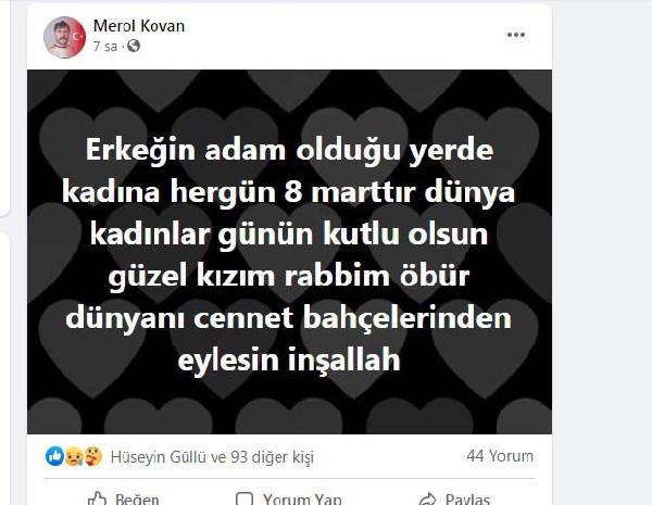 Kızını kaybetmenin acısını yaşayan baba Merol Kovan, sosyal medyadan yaptığı paylaşımla duygulandırdı. Kadın cinayetlerinin son bulmasını isteyen baba, paylaşımında, "Erkeğin adam olduğu yerde kadına her gün 8 Mart'tır. Dünya Kadınlar Günün kutlu olsun güzel kızım. Rabbim öbür dünyanı cennet bahçelerinden eylesin inşallah" dedi.