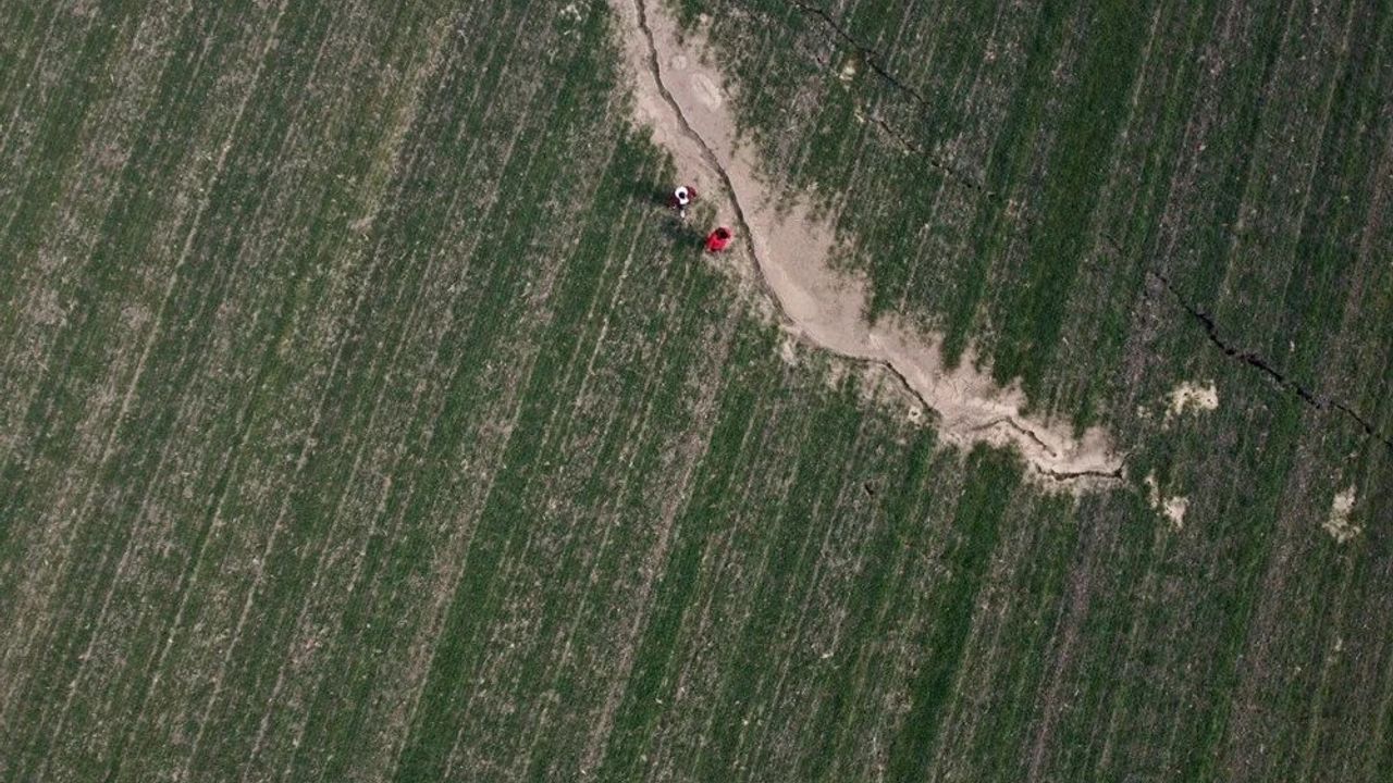 Öte yandan köyden geçen ve araziyi ikiye bölen fay kırığı da havadan görüntülendi.