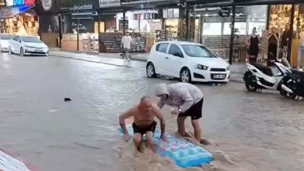 Muğla'nın Fethiye ilçesinde etkili olan yağmur, yabancı bir turistin eğlencesi haline dönüştü. Suyla dolan caddede deniz yatağına uzanan bir turist içeceğini yudumlayıp, anın keyfini çıkarırken o anlar çevredekiler tarafından cep telefonuyla görüntülenip, sosyal medyada paylaşıldı.