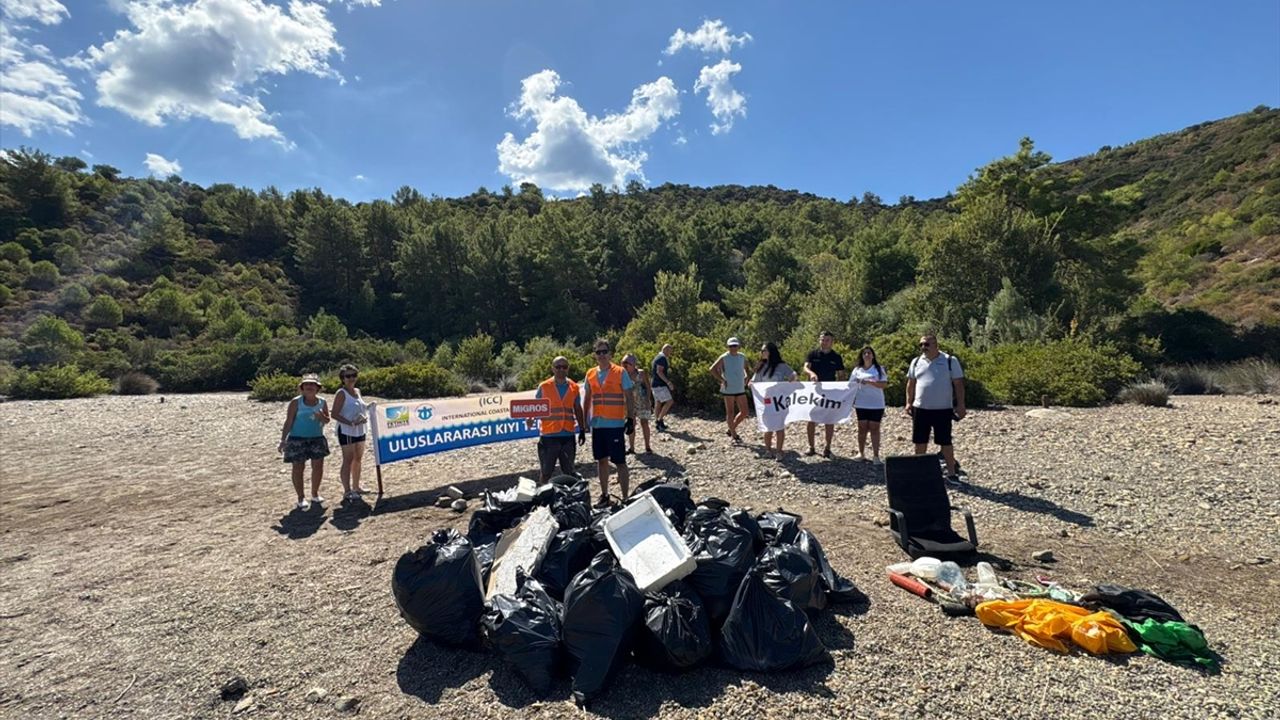 Foça Mahallesi Çalış mevkisinden kalkan tekneyle Kızılada'ya ulaşan gönüllüler, yaklaşık 2 saatte 110 kilogram çöp topladı.