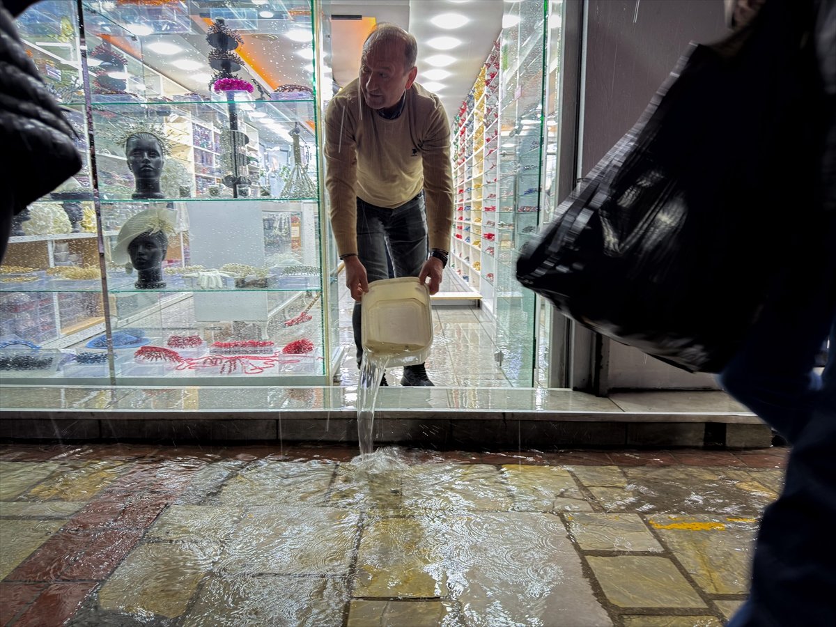 Konak'ta Kemeraltı Çarşısı'nda da bazı iş yerlerini su bastı, iş yeri sahipleri suyu tahliye etmeye çalıştı.