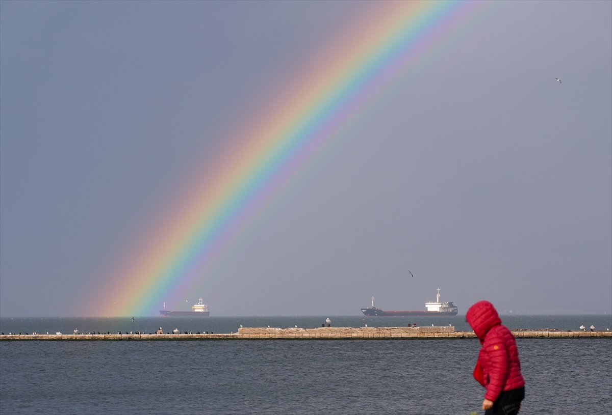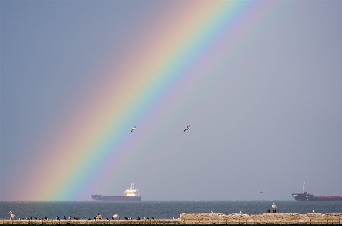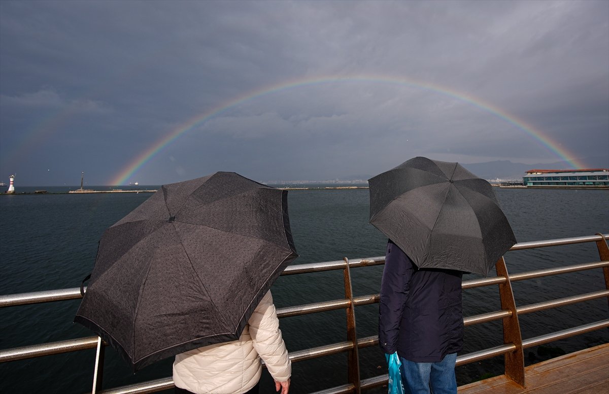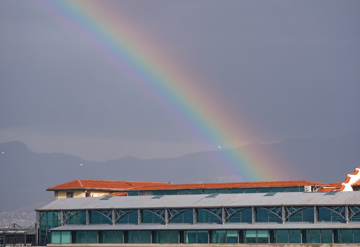 İzmir'de yağmurun ardından ortaya çıkan gökkuşağı, güzel görüntü oluşturdu. Konak Sahili yakınlarında bulunan bazı vatandaşlar gökkuşağını seyrederek vakit geçirdi.