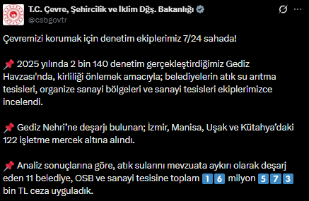 GÜNDEME BAKIŞ- T.C. Çevre, Şehircilik ve İklim Değişikliği Bakanlığı, Gediz Havzası’nda yürütülen denetimlere ilişkin açıklama yaptı. Bakanlığın sosyal medya hesabından yapılan paylaşıma göre, 2025 yılı içerisinde Gediz Havzası’nda toplam 2 bin 140 denetim gerçekleştirildi.