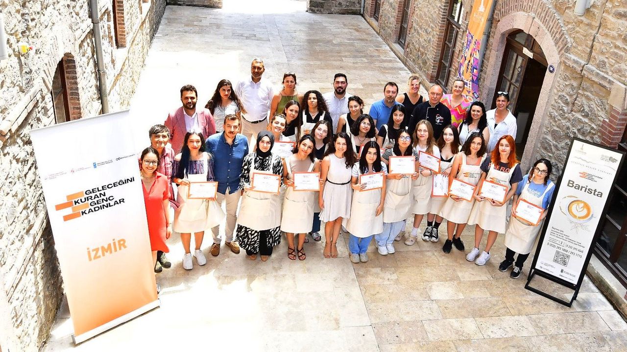 İşgücü potansiyelini attırmak ve kalifiye eleman yetiştirmek üzere hizmet veren İzmir Büyükşehir Belediyesi Meslek Fabrikası’nda Barista kursu alan 19 öğrenci sertifikalarını törenle aldı. Meslek Fabrikası binasında düzenlenen törene İzmir Büyükşehir Belediyesi Sosyal Projeler Dairesi Başkanı Anıl Kaçar, Birleşmiş Milletler Kalkınma Programı Koordinatörü Güvenç Küçüktok, Sabancı Vakfı Proje Yöneticisi Şimal Yavaş, büyükşehir bürokratları, kursiyerler katıldı. Ne Eğitimde Ne İstihdamda (NEET) kapsamında “Geleceğini Kuran Genç Kadınlar” projesine katılan kadınlar bir aylık sürenin sonunda sertifikalarına kavuştu. Yaklaşık 4 ay önce de NEET projesi kapsamında 25 genç kadın protez tırnak ve nail art kursundan mezun oldu.