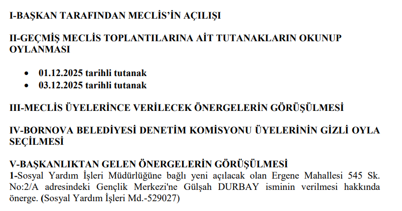 Yayınlanan meclis gündemine göre, söz konusu önerge Sosyal Yardım İşleri Müdürlüğü tarafından hazırlandı. Önergede, Ergene Mahallesi 545 Sokak No: 2/A adresinde faaliyete geçecek olan gençlik merkezine “Gülşah Durbay Gençlik Merkezi” adının verilmesi talep ediliyor.