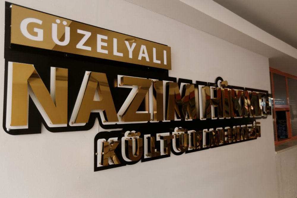 Kültür merkezine gelenler, giriş kapısı ve holden itibaren her adımda Mavi Gözlü Dev’in fotoğraf ve şiirleriyle karşılanıyor. Duvarlarda yer alan tarihi fotoğraflarda Nazım Hikmet’in vatan sevgisi ve özlemi, aşkları, hem fotoğraflar hem de şiirlerle adeta bir zaman tüneli yaratıyor. Fuayenin yanı sıra katlar arasında kalan merdivenler ile koridorların duvarları da Nazım şiir ve fotoğraflarıyla kaplanan merkez, sanatseverlere Nazım Hikmet müzesindeymiş hissi yaşatıyor. Merkezde yer alan şiirler arasında büyük ustanın eşsiz eseri Kuvayi Milliye Destanı’ndan dizeler de yer alıyor.