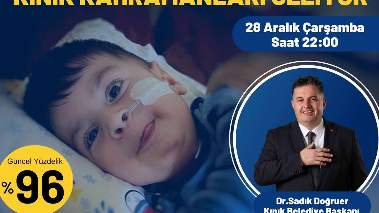 Kampanyanın tamamlanmasına sadece yüzde 4 kaldı. Kınık Kaan Efe gönüllüleri bağış kampanyasının son düzlüğünde kampanyayı bitirmek için tüm hayırseverleri 28 Aralık 2022 Çarşamba yani bugün saat 22:00'daki Kaan Efe instagram canlı yayınına bekliyor. Son bağış yayını olması ümit edilen yayına kampanyaya başından bu yana çok destek olan Kınık Belediye Başkanı Dr. Sadık Doğruer de katılacak. Bu akşam gerçekleştirilecek canlı yayın @kaanefeyenefesol (https://www.instagram.com/kaanefeyenefesol) instagram hesabı üzerinden başlatılacak. Yapılan bağışlardan dolayı son derece mutlu olan anne Mehtap ve baba Barış Şanal ise evlatlarının bir an önce sağlığına kavuşması için dua ediyor ve herkesi bu canlı yayına ve bağış kampanyasına destek olmaya davet ediyor.