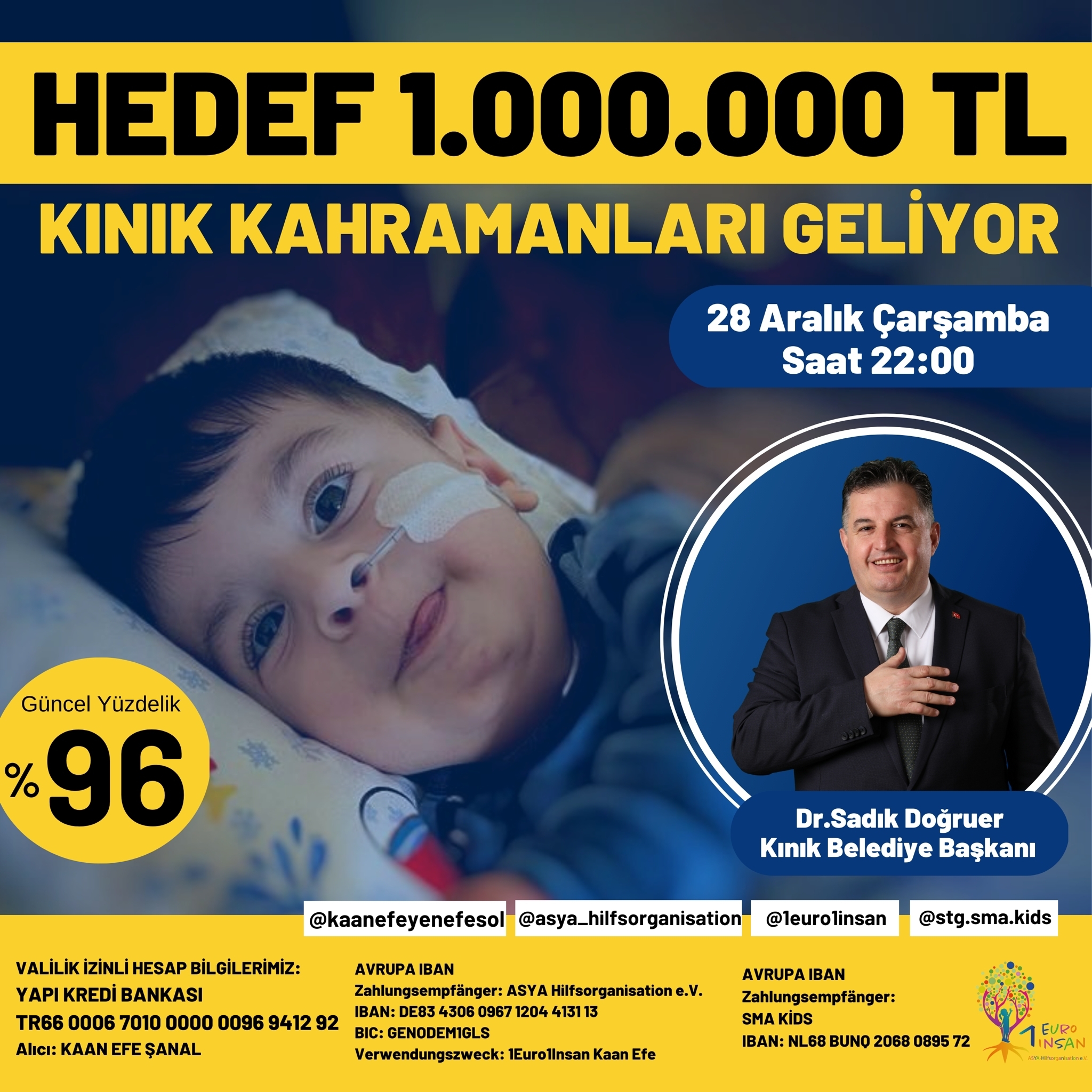 Tedavisi için gereken 3 milyon doların yüzde 96 ‘sına ulaşılan bağış kampanyasının tamamlanmasına çok az kaldı. Kınık Kaan Efe Gönüllüleri başta olmak üzere Kınık esnafı, iş adamları ve çok sayıda hayırsever Kaan Efe bebeğin tedavisi için gerekli olan paranın kalan kısmının toplanması için adeta seferberlik başlattı. Tedavinin kalan miktarının tamamlanması için bağış toplayan ve canlı yayınlar ile yardım kampanyasına destek olan Kınık Kaan Efe Gönüllülerini hayırseverler ve iş adamları da yalnız bırakmadı. Yapılan bağışlar ile SMA TİP1 hastası Kaan Efe Şanal, kendisine umut olacak tedaviye bir adım daha yaklaştı.