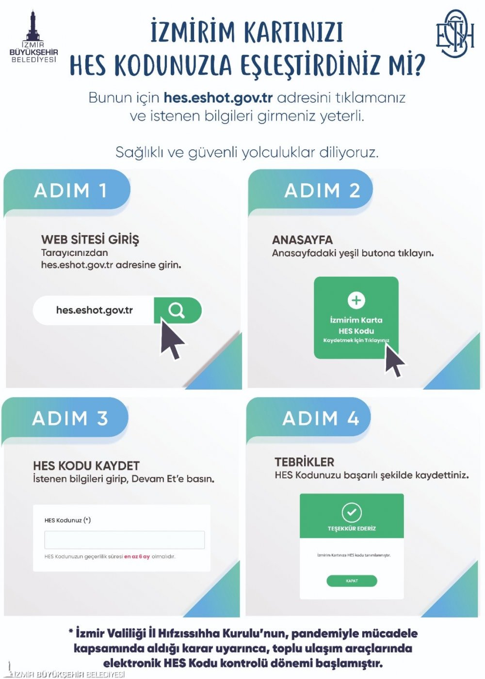 İzmir Büyükşehir Belediyesi; İçişleri Bakanlığı’nın pandemiyle mücadele çalışmaları kapsamında çıkardığı genelge ve buna istinaden İzmir Valiliği İl Hıfzıssıhha Kurulu’nun aldığı karar gereğince, toplu taşıma araçlarında “elektronik HES Kodu kontrolü” uygulamasını 30 Ekim’de başlatmıştı. Vatandaşların, İzmirim Kartlarını, HES kodları ile eşleştirmeleri için 15 Kasım’a kadar süre verilmişti. Bu süre, 30 Kasım’a uzatıldı.