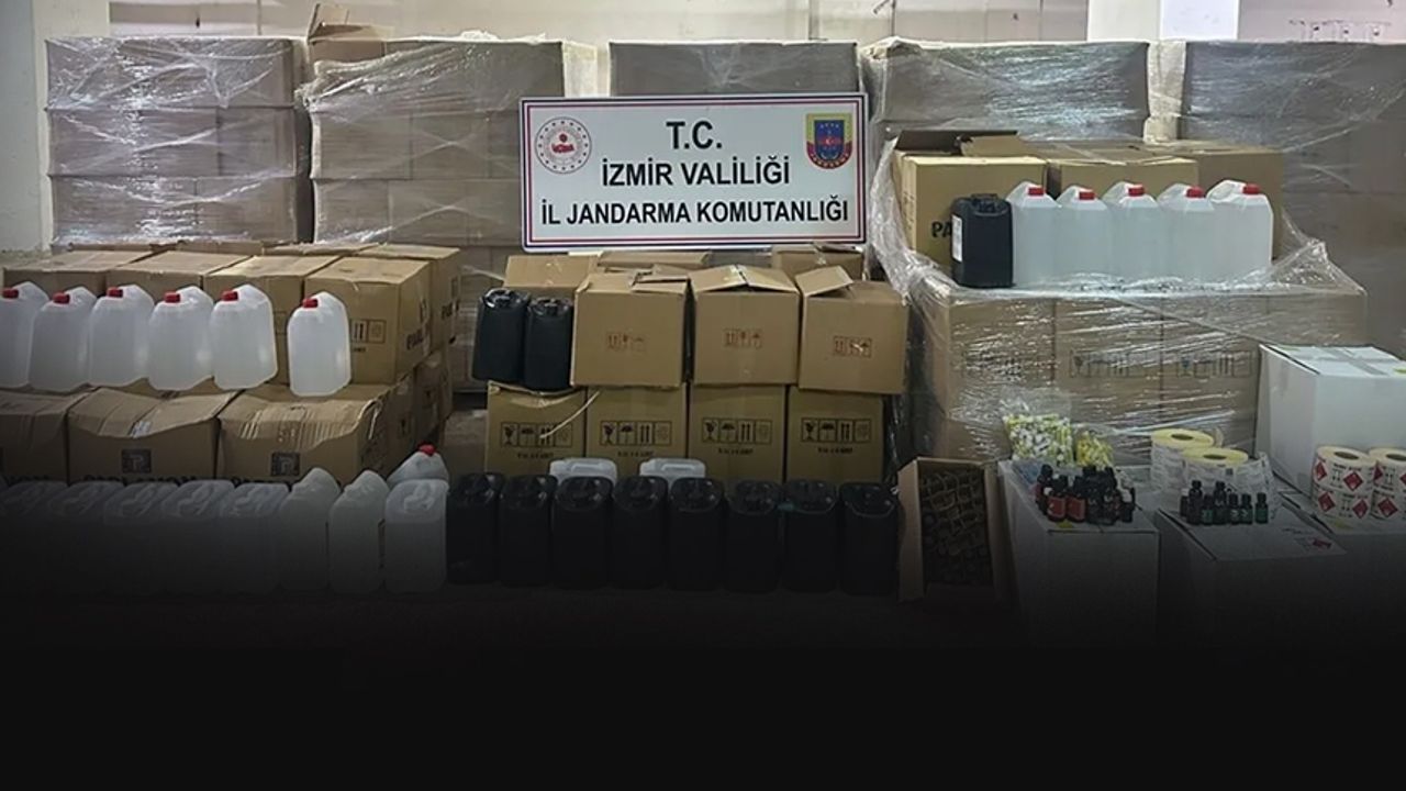 Konak ilçesinde faaliyet yürüten bir ecza deposunda yapılan aramalarda, 7 ton etil alkol, 62 bin 300 sahte etil alkol etiketi ve 242 aroma ele geçirildi.