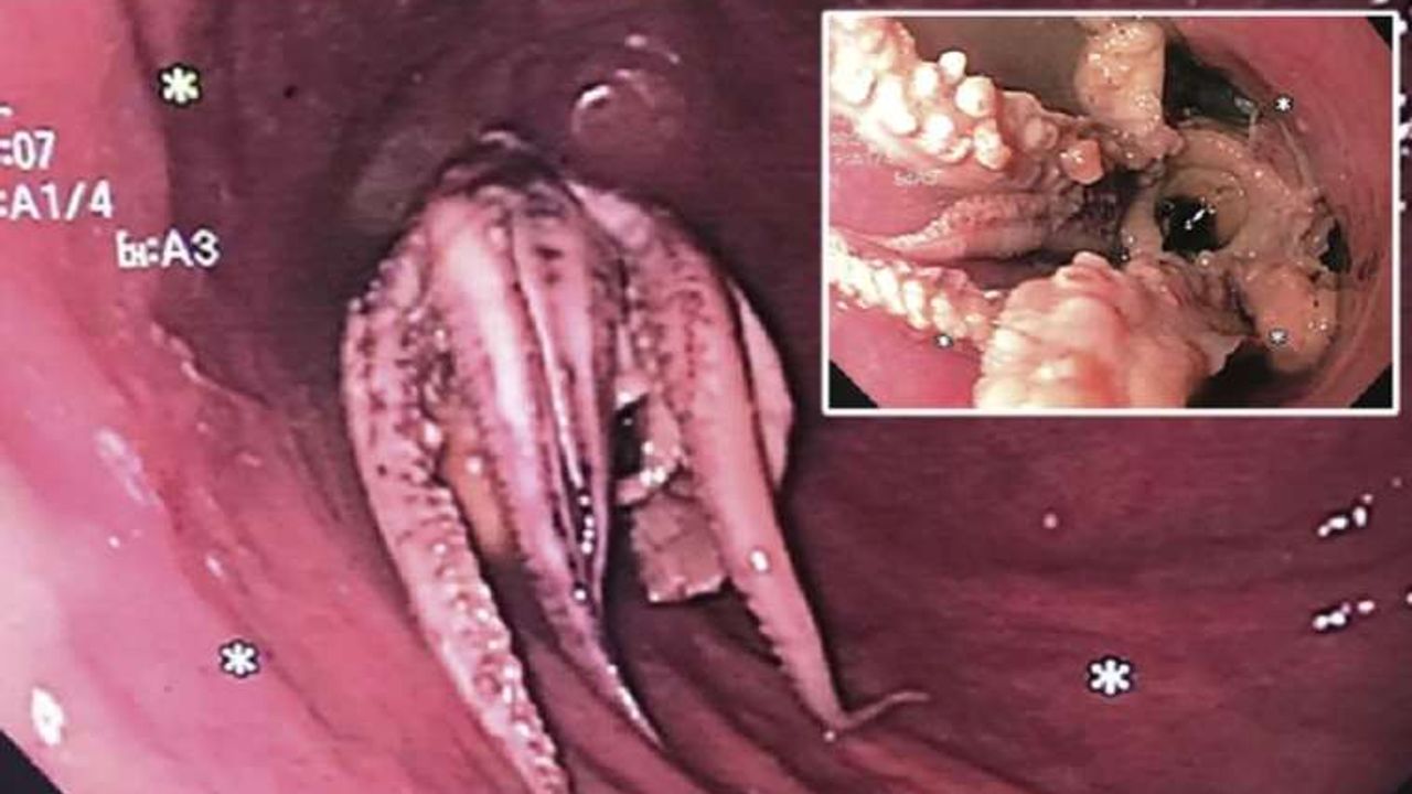 Endoskopi yöntemiyle yapılan muayenede hastanın yemek borusuna 5 cm kadar saplanan bir ahtapot tespit edildi. Başlangıçta, ahtapot gıda sıvısı ittirilerek çıkarılmaya çalışıldı. Ancak çıkarma işlemi başarısız oldu. Daha sonra gıda sıvısı mideye doğru dikkatlice ilerletildi ve mideye retrofleksleme yapıldı.